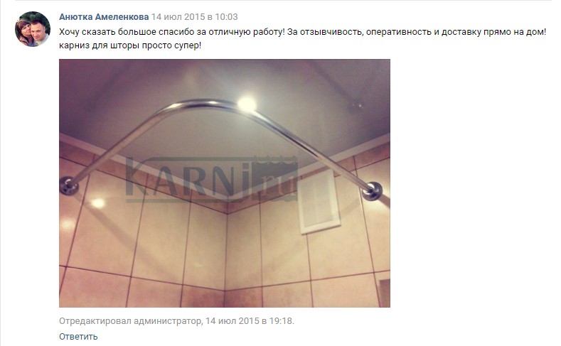 Спасибо магазину http://karni.ru/ Прислали качественный карниз для шторы в ванной, точно по размерам и быстро. Доволен вашей работой, вожделенная занавеска уже висит, всё крепко и красиво.