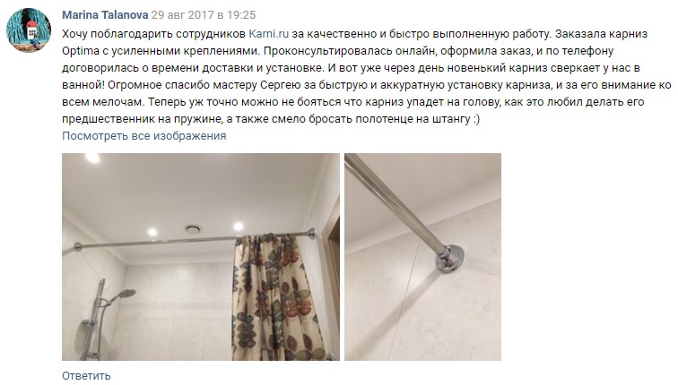 Хочу поблагодарить сотрудников Karni.ru за качественно и быстро выполненную работу. Заказала карниз Optima c усиленными креплениями. Проконсультировалась онлайн, оформила заказ, и по телефону договорилась о времени доставки и установке. И вот уже через день новенький карниз сверкает у нас в ванной! Огромное спасибо мастеру Сергею за быструю и аккуратную установку карниза, и за его внимание ко всем мелочам. Теперь уж точно можно не бояться что карниз упадет на голову, как это любил делать его предшественник на пружине, а также смело бросать полотенце на штангу :)
