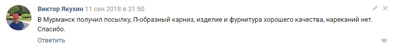 В Мурманск получил посылку, П-образный карниз, изделие и фурнитура хорошего качества, нареканий нет. Спасибо.